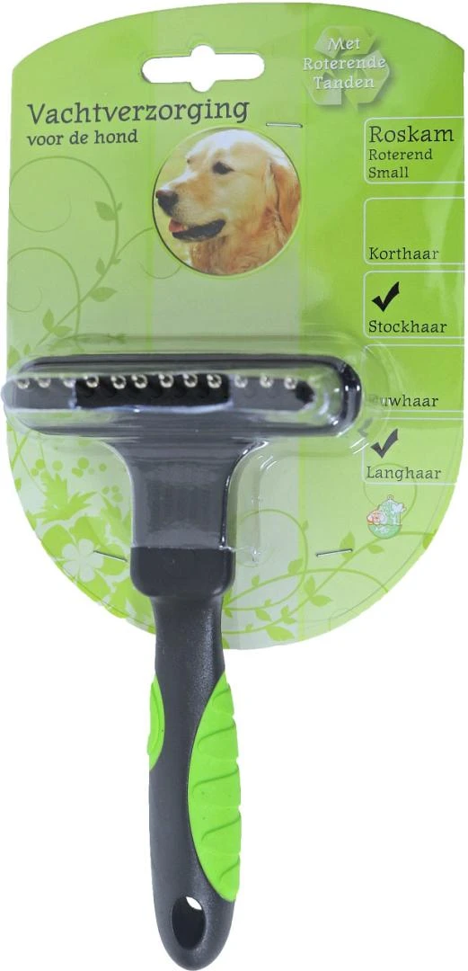 De roskam met roterende pennen small is uitermate geschikt voor het ontklitten of ontwollen van de vacht. Deze roskam is uitermate geschikt voor alle honden met een middellange tot lange vacht. Door de ergonomische vorm is deze kam minder belastend voor jouw lichaam, de roterende tanden zorgen ervoor dat de kam gemakkelijker door de vacht glijdt.