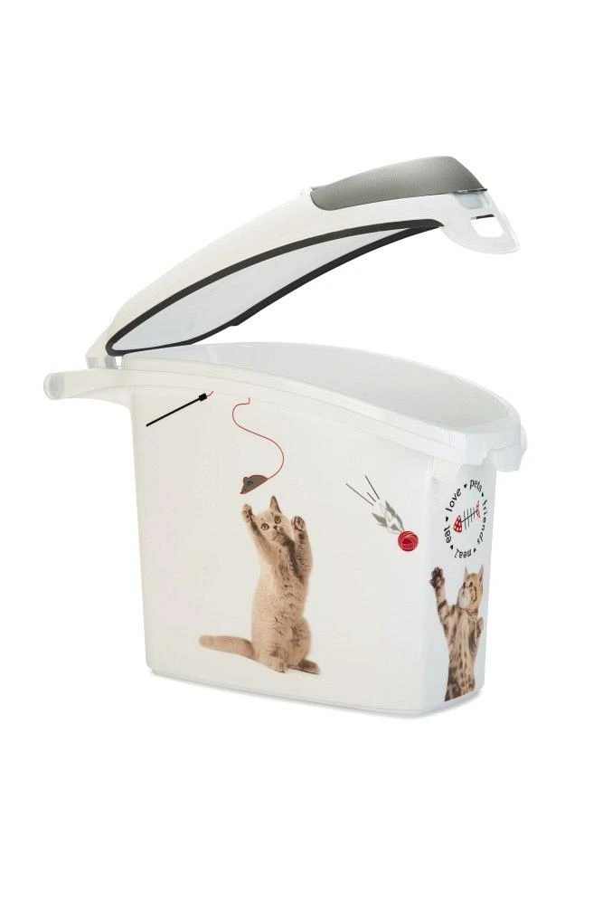 De container bevat een klepje aan de bovenkant, zodat je de brokjes gemakkelijk in een kattenvoerbak kunt schenken. Voorzien van een handvat, zodat je de voedselcontainer gemakkelijk kunt verplaatsen. Leuk detail: voorzien van diverse kattenprints.