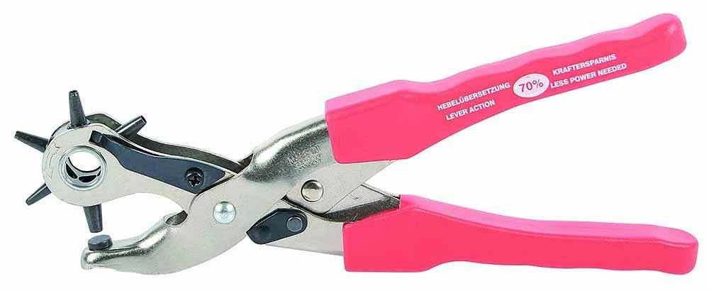 Zilverkleurige gaatjestang met stevig kunststof handvat en is draaiend verstelbaar op 6 verschillende standen. Deze tang is uitgevoerd met een hevel welke er voor zorgt dat 70% minder knijpkracht is vereist. Dit is een proffesioneel model, handig en snel in gebruik.