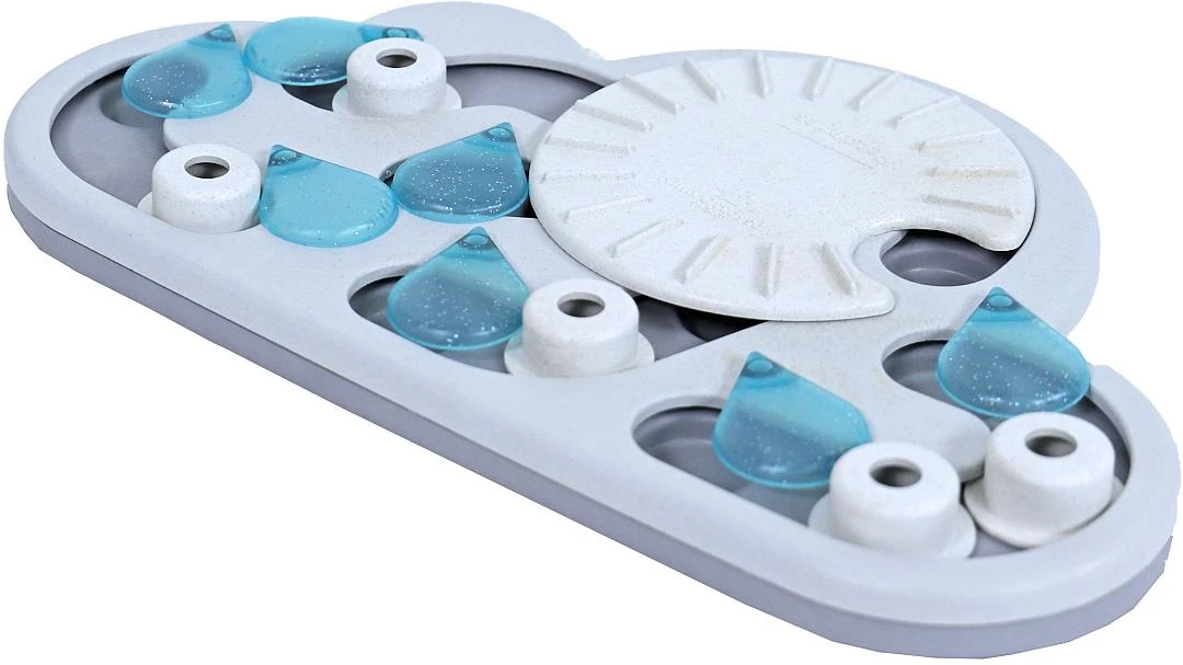 Met de Nina Ottosson Rainy Day kan jouw kat slaan tegen de schijven, draaien aan het wiel en de regendruppels laten ronddraaien om de 14 verborgen snoepcompartimenten te ontdekken.