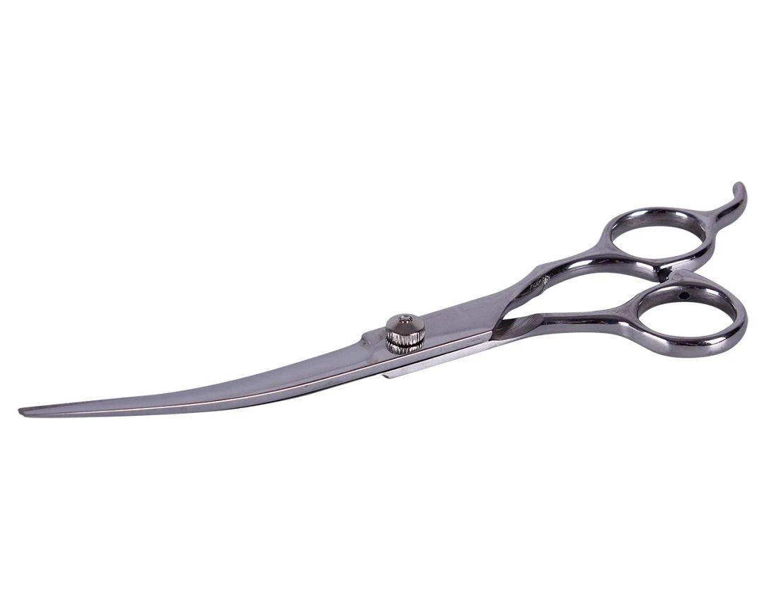 QHP toiletteerschaar gemaakt van RVS met gebogen lemmeten waardoor veilig kan worden geknipt op lastige plekken. De schaar is voorzien van een vingersteun en verstelbare schroef.