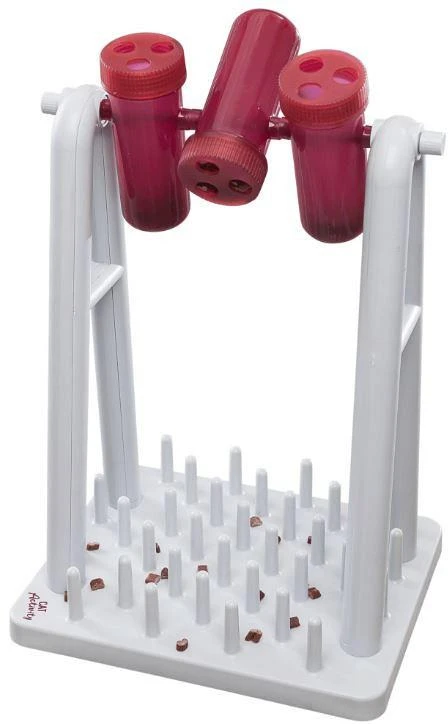 2 spelmodules: grondplaat met pennen en 3 draaibare elementen met 2 verschillende deksels lichamelijke bezigheid en geestelijke uitdaging schoolt de behendigheid kunststof slipvast door rubberen voetjes ook geschikt voor oudere of zieke dieren draaibare onderdelen vaatwasserbestendig incl. handleiding met tips en handigheidjes voor een optimale training