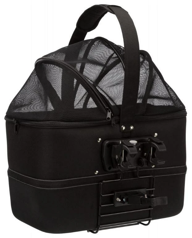 Ook heeft de mand een regenkap voor reizen bij slechte weersomstandigheden. En heb je de afdekking toch liever open? Dan kun je jouw hond vastmaken aan de geïntegreerde korthouder, zodat de hond lekker om zich heen kan kijken zonder dat hij uit de mand springt. Deze mand is ook als vervoerstas te gebruiken: door het gemakkelijke click & go systeem kun je hem zo van de beugel afhalen en meenemen als stevige draagtas.