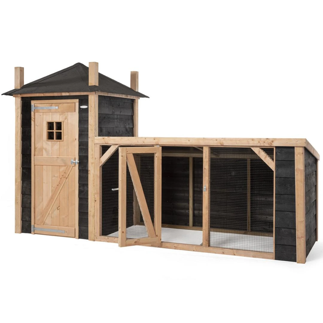 Het nachthok is ontworpen met de klassieke details van een hooiberg, wat een stijlvolle uitstraling geeft aan dit verblijf. Het stevige frame van het hok is gemaakt van geïmpregneerde houten balken welke een robuuste basis geeft aan het geheel. De buitenzijde is verstevigd met Douglas balken welke tevens de dakconstructie ondersteunen. Doordat het verblijf is afgewerkt met zwarte potdekseldelen ontstaat een stijlvol totaalplaatje welke zeker niet zou misstaan in de achtertuin. Via de grote toegangsdeur kun je het hok eenvoudig zelf betreden. De grote toegangsdeur is voorzien van een schuifslot, robuuste scharnieren én een plexiglas venster voor meer daglicht.