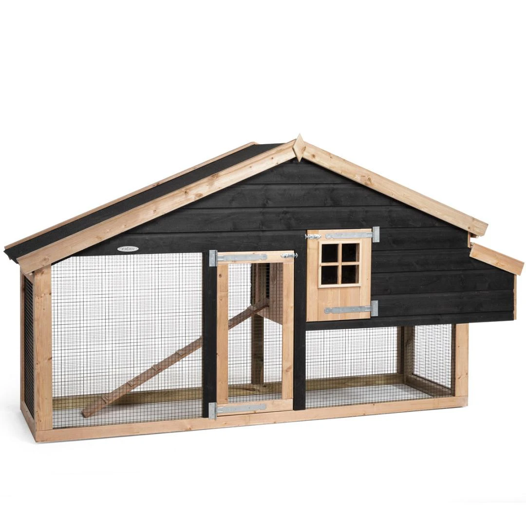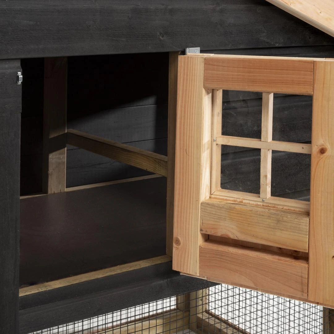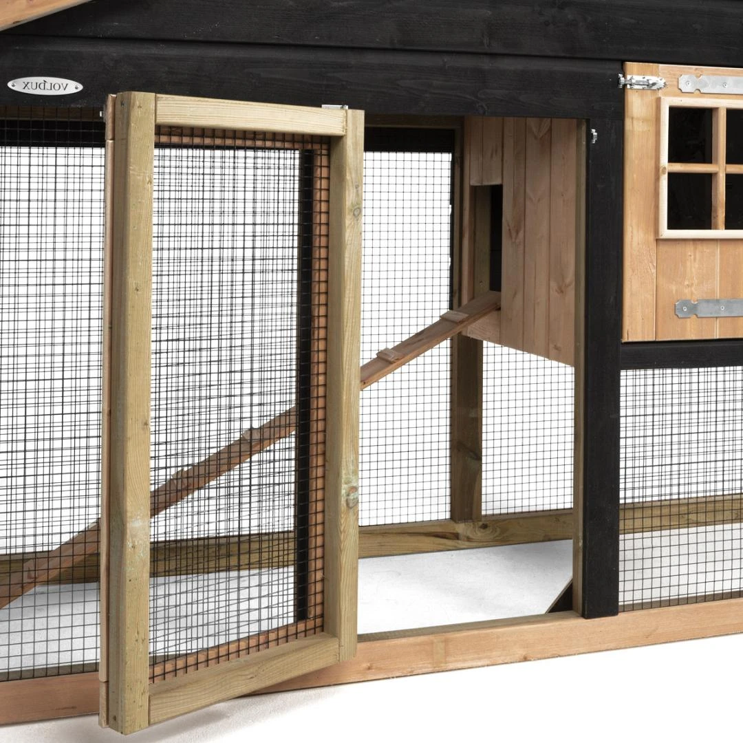 Het Voldux Kippen- of konijnenhok Remco bestaat uit een ruim opgezet nachthok én een ren om lekker te kunnen scharrelen of rondhoppen. De uitstraling van het verblijf is te danken aan de combinatie van verschillende hoogwaardige materialen. Zo is het hok opgebouwd met een frame van geïmpregneerd hout, is het hok afgewerkt met prachtige zwarte rabatdelen én is voor de afwerking gekozen voor Douglas hout. Om het totaalplaatje compleet te maken is het hok voorzien van hoogwaardig en stevig zwart gecoat 19×19 gaas.
