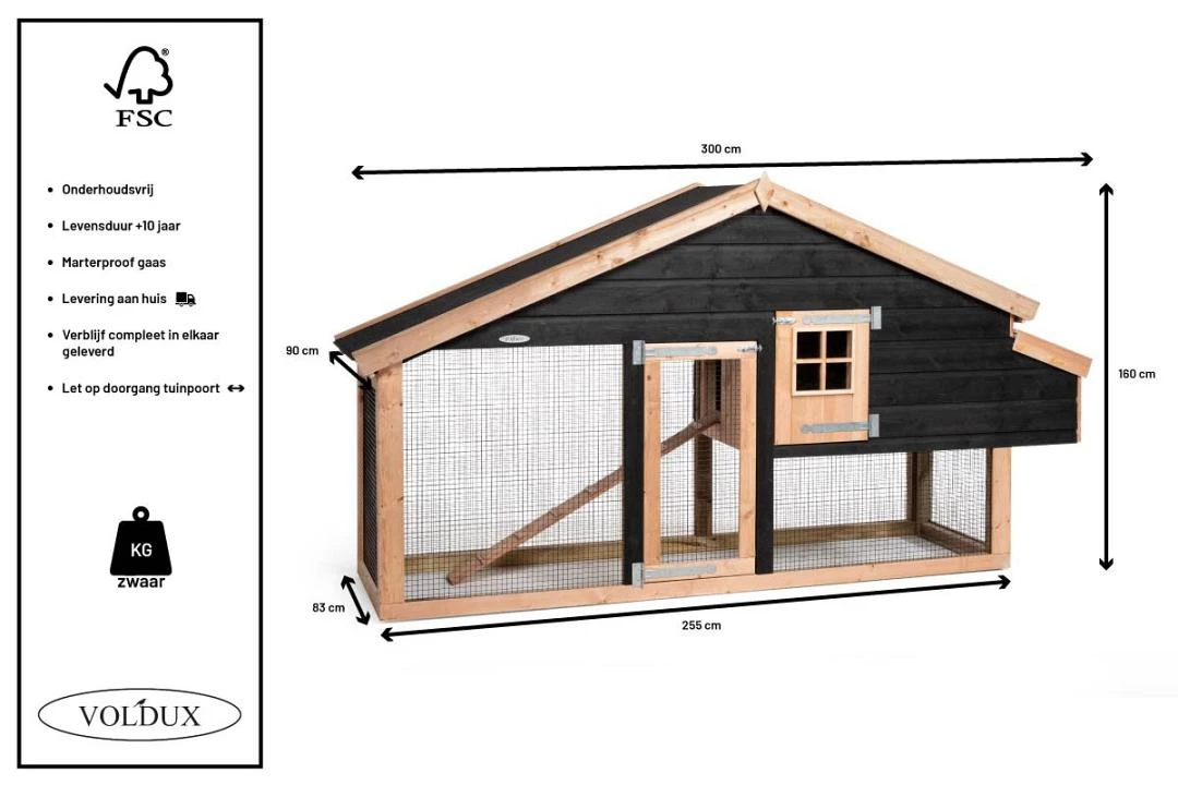 Het grote hok heeft een afmeting van 300 x 90 x 160 cm, waardoor er voldoende ruimte is voor meerdere kippen. Het nachthok is voorzien van een zitstok voor de nacht én natuurlijk een ruim legnest voor de eitjes. Dit legnest is open te klappen waardoor je het hok niet hoeft te betreden voor het rapen van eieren. Wanneer je het hok wilt schoonmaken, kun je gebruik maken van de grote toegangsdeur in de ren of het deurtje in het nachthok. Dit complete verblijf is perfect voor de huisvesting van jouw kippen én is een aanwinst voor de tuin.